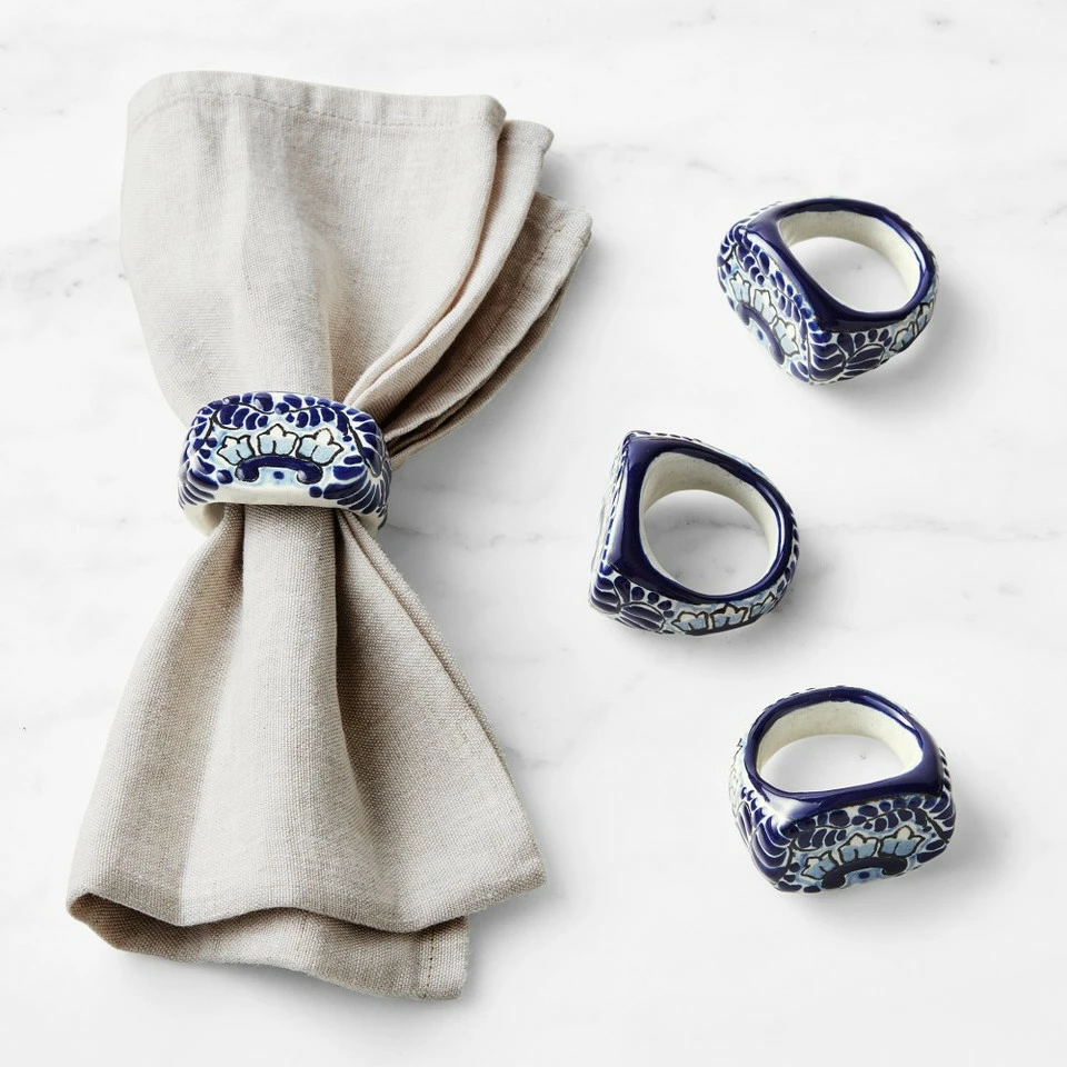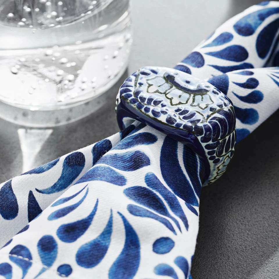 Crafted according to Talavera de Pueblatradition by one of Mexico’s premier ceramic makers, our Azulete napkin rings feature a classic design from the 19th century. Each piece is made from high-fired ceramic, handpainted with feathered cobalt designs and finished with a clear, protective glaze.