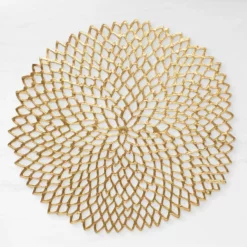 Drawing inspiration from nature, this textural placemat brings graceful shape and tonal colour to the table. The circular mat is crafted for indoor or outdoor use in a pattern that captures the curved, overlapping lines of dahlia petals. Its metallic finish makes it well suited for both everyday use and special-occasion meals.