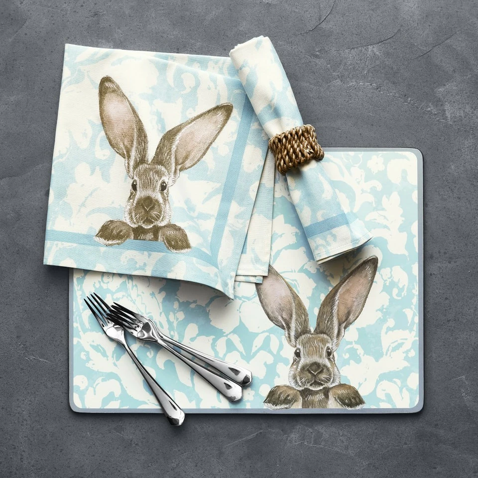 Brighten your Easter celebrations with our vintage-style napkins, decorated with playful portraits of woodland bunnies. Expertly printed for us by a European mill, the design pairs the bunnies with a backdrop of pale blue floral damask for a look that’s both elegant and charming. Pair with other pieces from our Damask Easter Bunny collection, or with any simple white dinnerware.