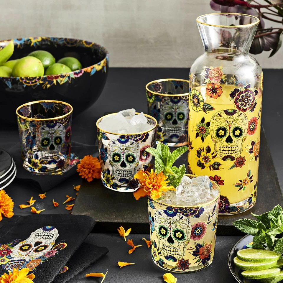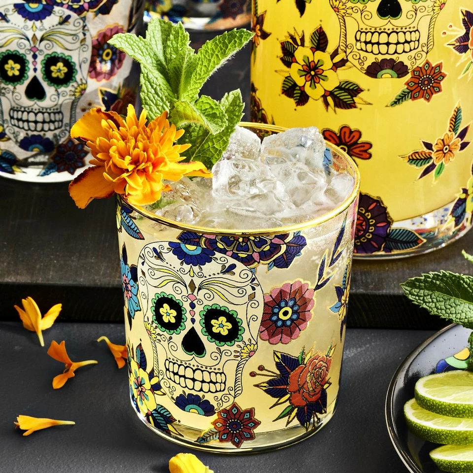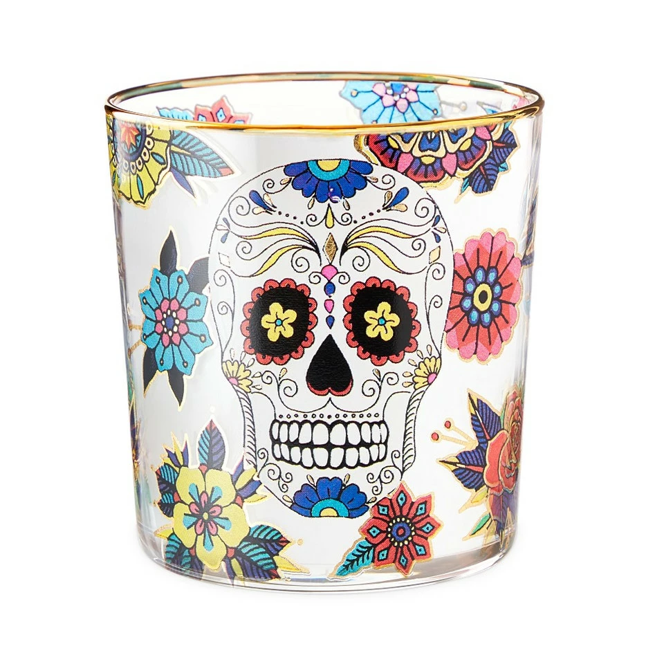 Our glass tumblers are hand decorated with iconic sugar skulls and colourful blossoms that honour the Day of the Dead. Featuring 24ct gold, the rims are painted by hand, adding a touch of elegance to the festive glasses. They’re perfectly sized for water, juice, iced tea and other chilled beverages.