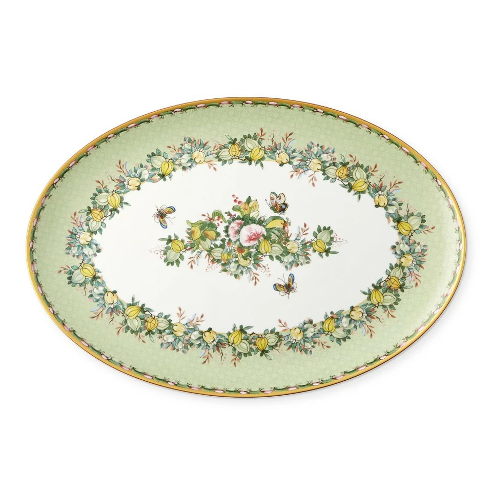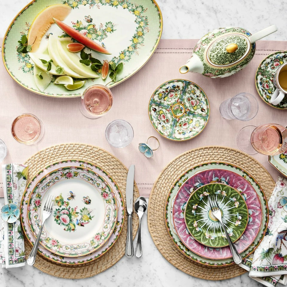 Fanciful, festive and inspired by Chinese porcelain, our hand-finished platter comes in an eye-catching colour palette and is embellished with a flora and fauna motif. The gold-rimmed porcelain piece layers beautifully with the rest of the statement-making collection for both everyday dining and special occasions.