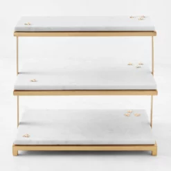 With its naturally cooling surfaces and space-efficient design, this three-tier stand is an entertaining essential. Each tier is handcrafted from solid marble engraved with a honeycomb pattern and accented with golden honeybees. The frame is built of durable stainless steel with a brass finish. Use it to serve everything from cakes and pastries to appetisers and charcuterie.