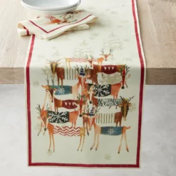 Named for the Italian word for Christmas, this collection transforms whimsical motifs into contemporary designs that appeal to guests of all ages. This runner is woven of pure linen at a family-owned mill in Tuscany. Its vibrant pattern of colourful reindeer in seasonal woollens coordinates easily with solid-hued dinnerware.