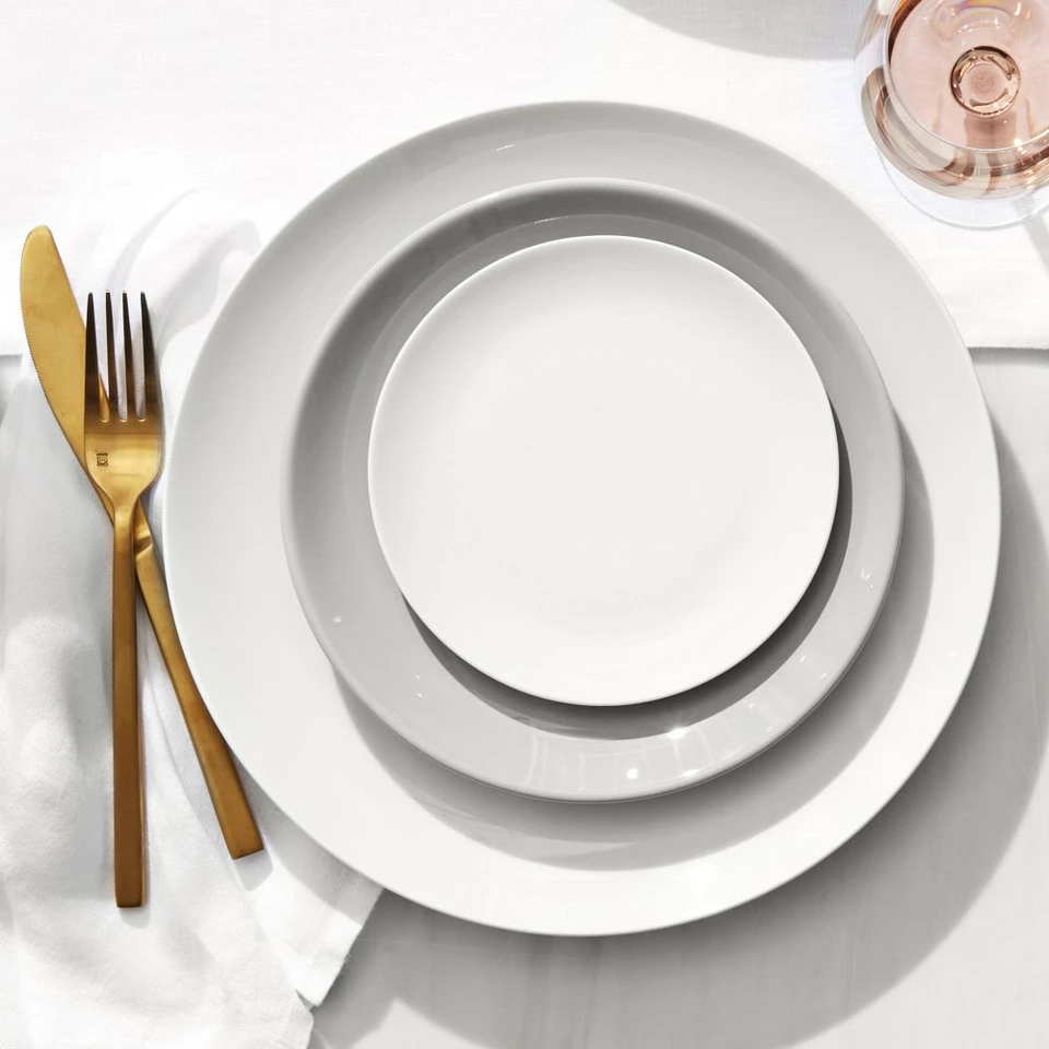 From France, this white porcelain dinnerware is as sturdy as it is stylish. The plates and bowls feature a classic coupe design with a gentle contour and sleek rim. Thanks to an innovative formulation of various clays, the porcelain’s delicate appearance belies its strength. Dressed up or down with formal or casual table linen, cutlery and glassware, this versatile dinnerware coordinates easily with patterned pieces. They’re made in France by Pillivuyt, a company respected for fine porcelain tableware since 1818.