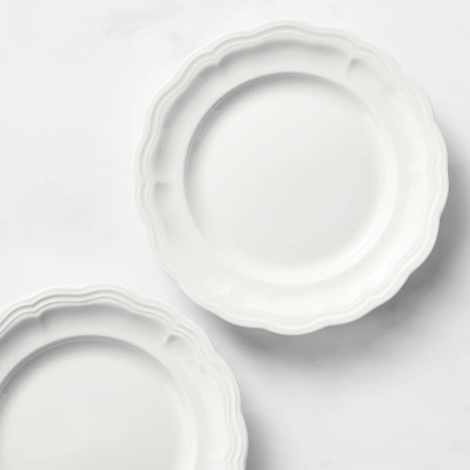 With its gently scalloped festonné rims, this porcelain dinnerware revives the elegant simplicity of a French classic. The pure white glaze complements food beautifully and suits casual as well as formal dining. The collection is made in France by Pillivuyt, a company respected for fine tableware since 1818. Microwavable and dishwasher safe.  23 cm salad plate. A Williams-Sonoma exclusive.