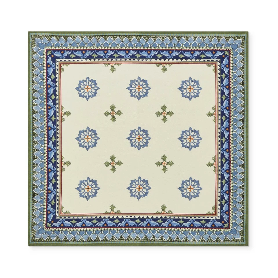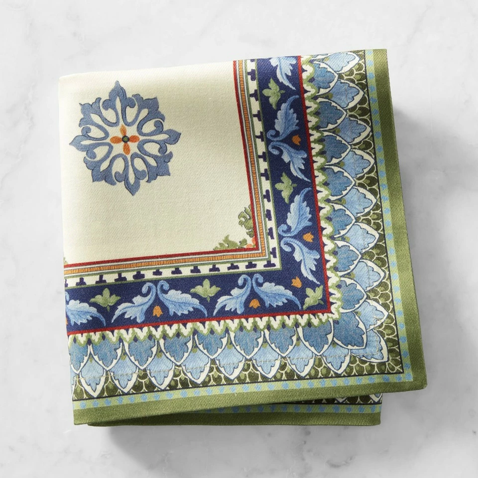 Woven for us in Italy, our OEKO-TEX®-certified cotton twill napkins bring Mediterranean style to your dinner table. Their nature-inspired motifs are borrowed from traditional Sicilian ceramics in warming shades of blue and green on a solid white ground.