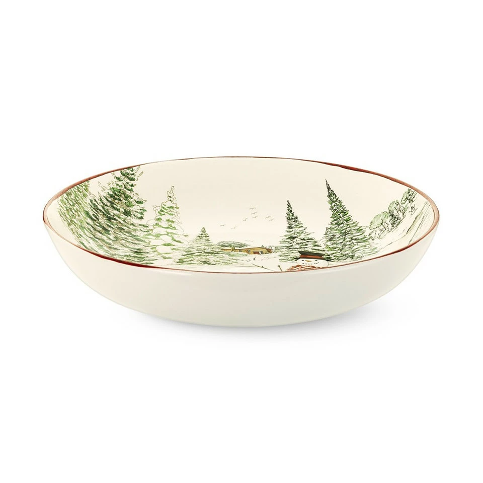 A glimpse from a classic snow village lends nostalgic charm to our serving bowl, featuring snow-capped pine trees, a gingerbread-inspired cottage and bundled up snowmen. The bowl illustrates delicate flecks of freshly falling snow and captures the snowmen’s delight in a whimsical style friends and family will adore. Crafted of glazed stoneware with rimmed detailing, the serving bowl brings the northern hemisphere’s beloved snowy icon to the table.