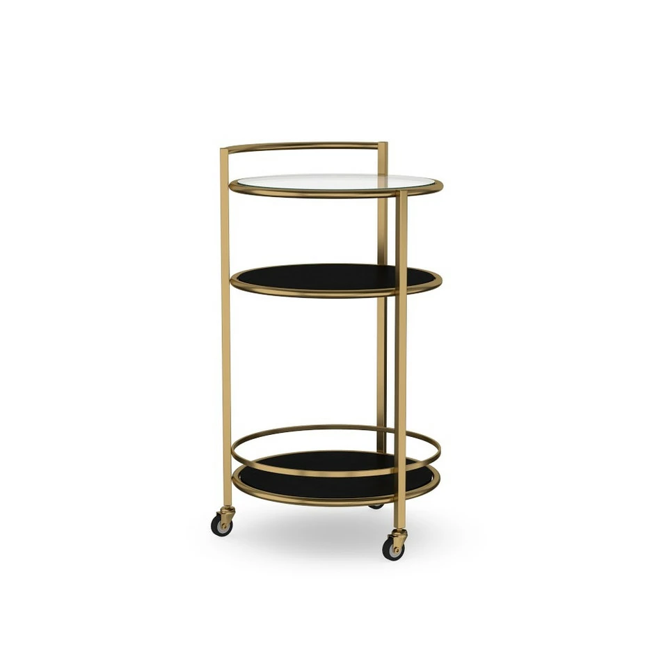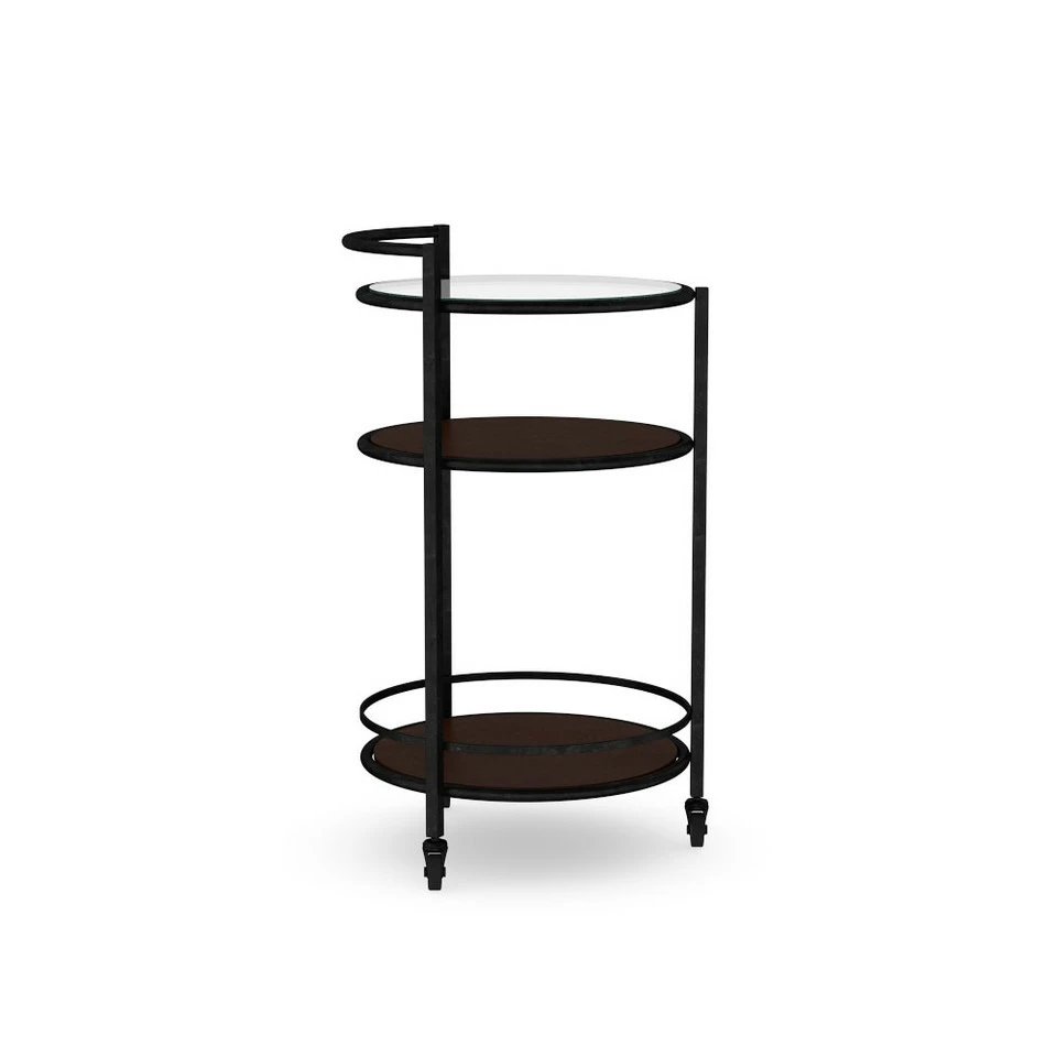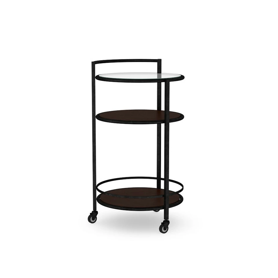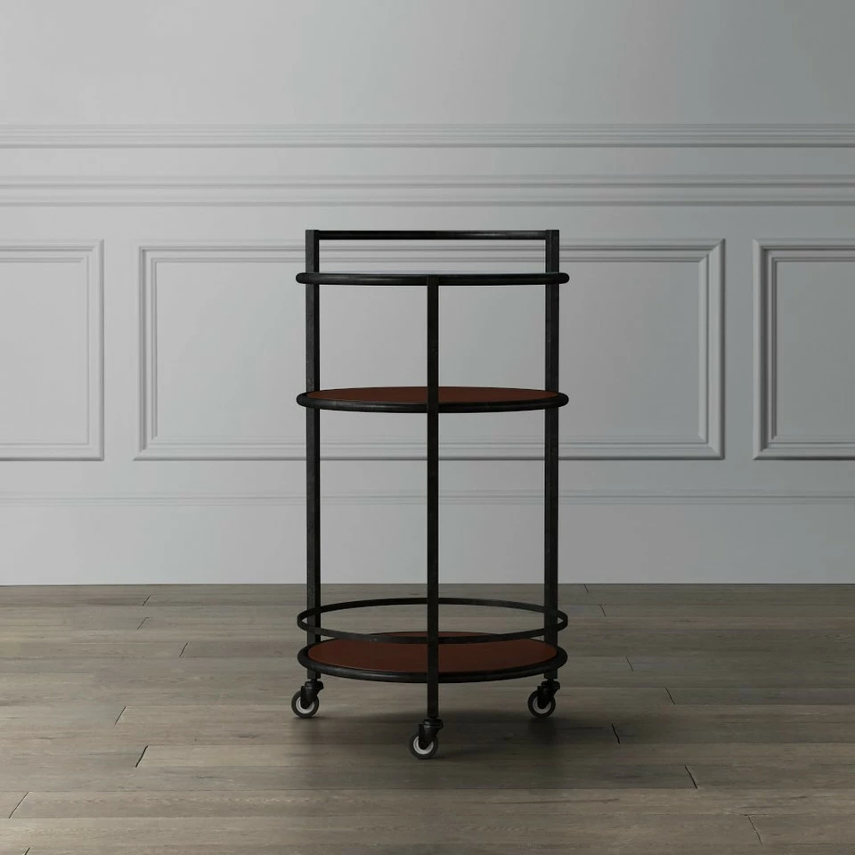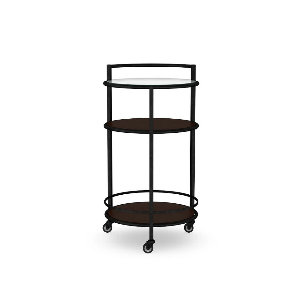 Our cart’s tempered glass top provides space for mixing and pouring, while two leather-clad shelves offer ample storage for glassware and spirits – all in a remarkably compact footprint. A gallery rail secures the contents of the bottom shelf, and the top handle doubles as a rack to hold a bar towel. Swiveling castors allow the cart to move easily from dining room to living room to terrace – wherever guests gather.