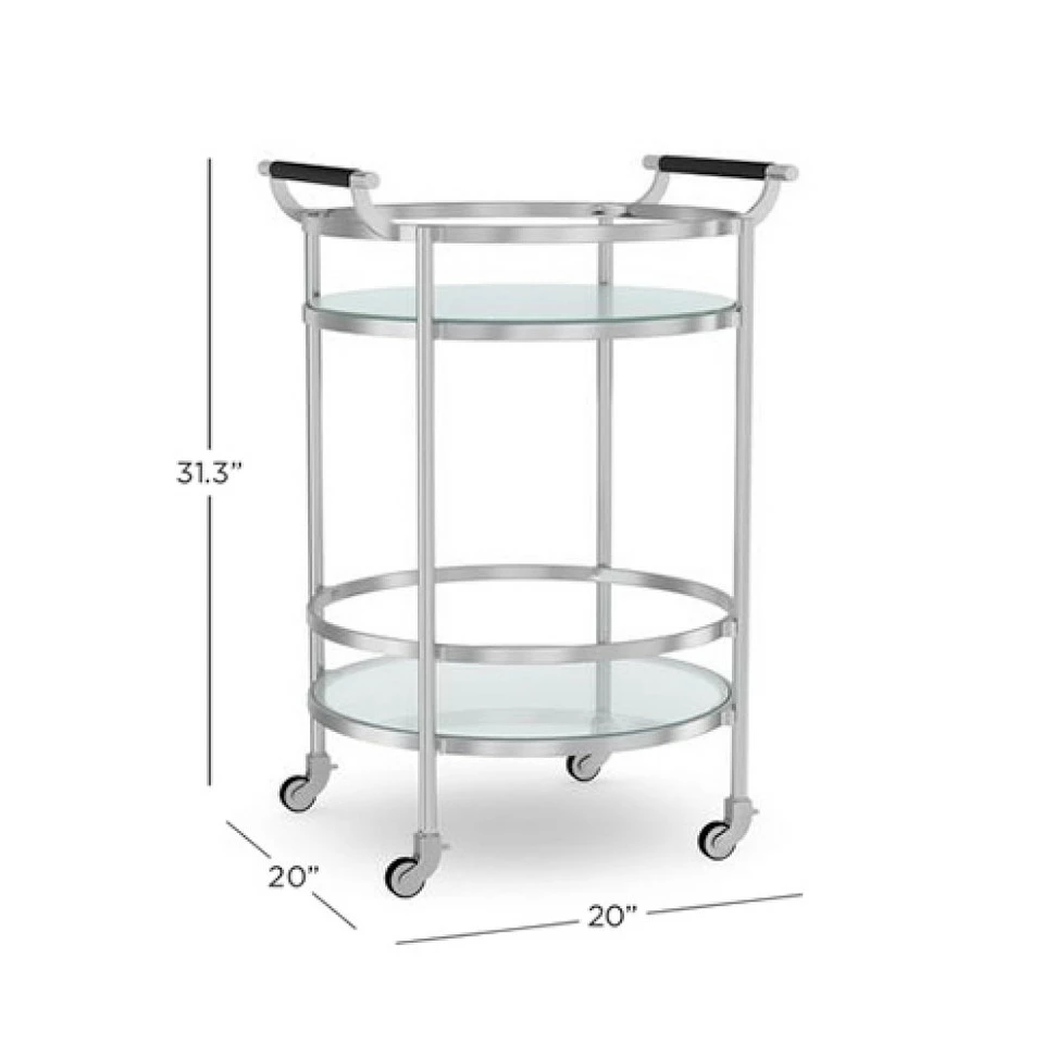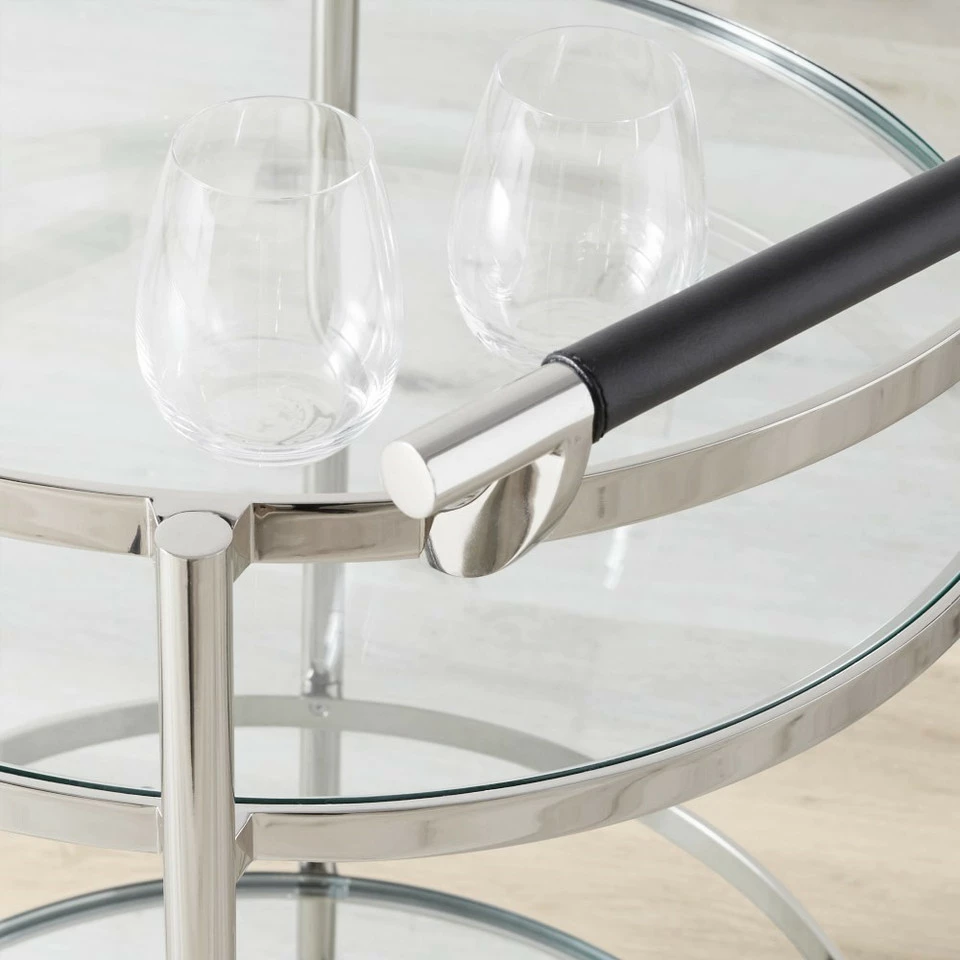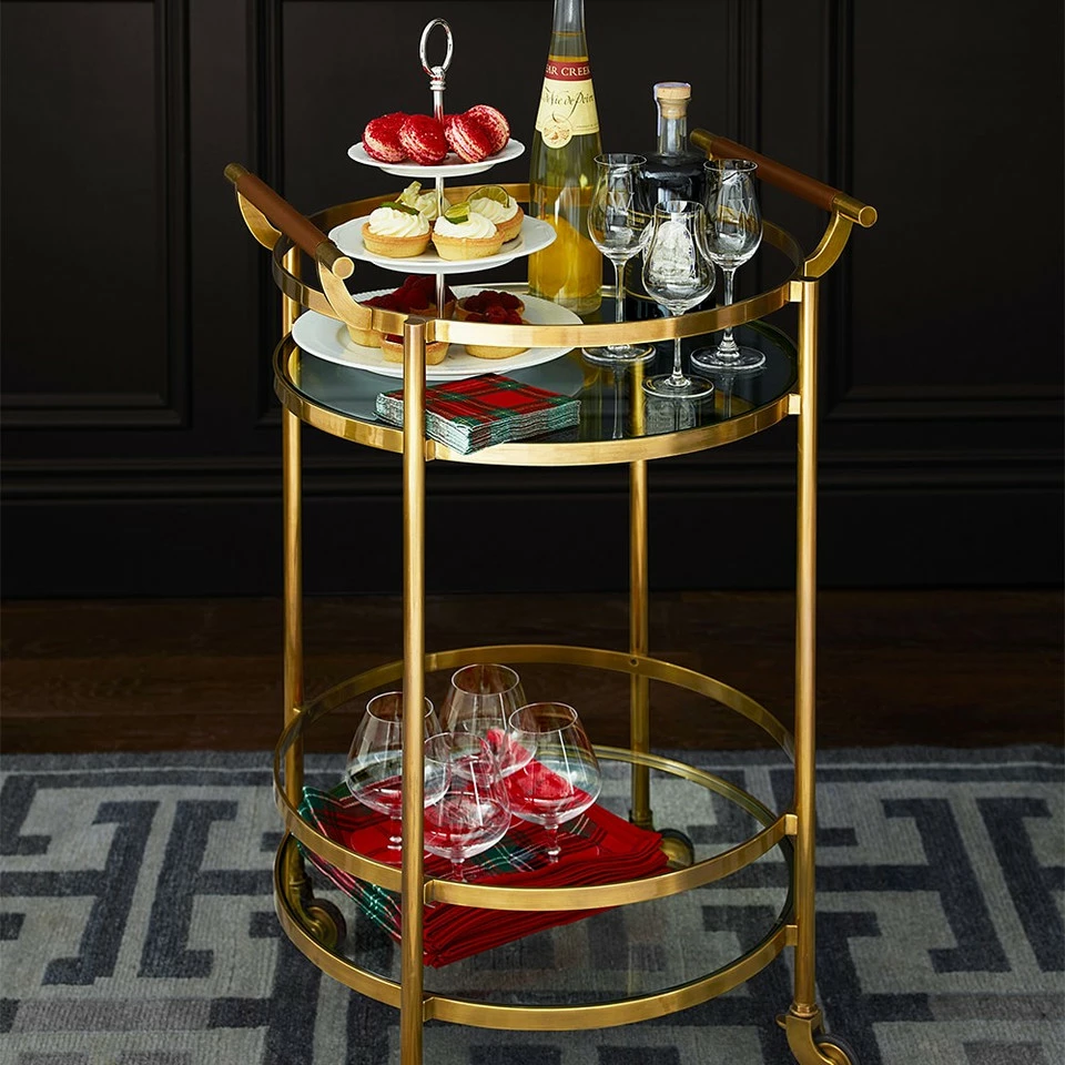 Mid-century-inspired design and highly functional features earn this entertaining essential a permanent place in the dining room, living room or den. Its strong steel frame is inset with two glass shelves surrounded by high gallery rails to secure bottles and glassware in transit. Expertly finished in your choice of antique brass, complemented by leather-wrapped handles.