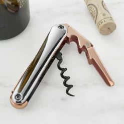 The world’s best sommeliers and wait staff rely on compact folding corkscrews like this one to open everything from simple table wines to the rarest vintages. Our efficient stainless-steel opener combines beauty with functionality by adding polished copper accents.